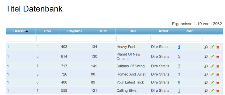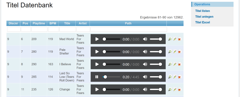 In der Musikdatenbank liegen die Informationen zu den Liedern. Sänger, Titel, Länge. CD-Nummer, Position auf der CD und CD-Name. Der Ablauf war also