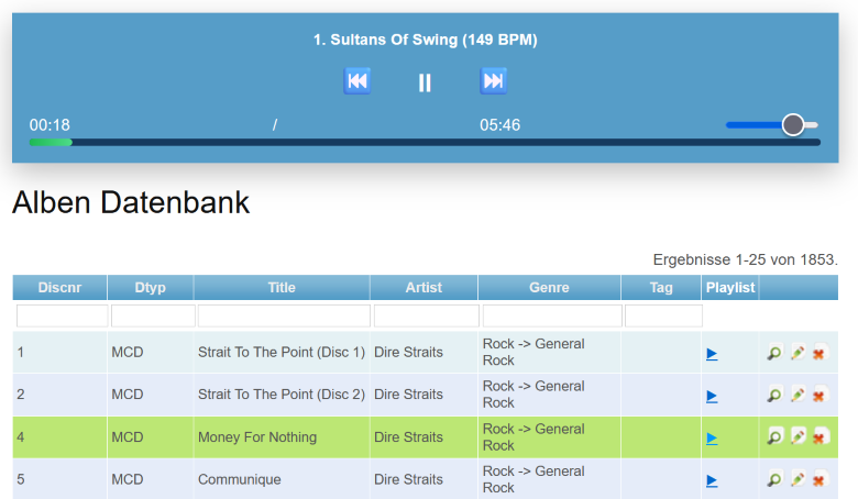 YII wurde dann so erweitert, dass es im TitelController eine actionPlaylist Funktion gibt, die beim Parameter id die Titel eines Albums nebst Dateiname, BPM und anderen Information als JSON bereitstellt.